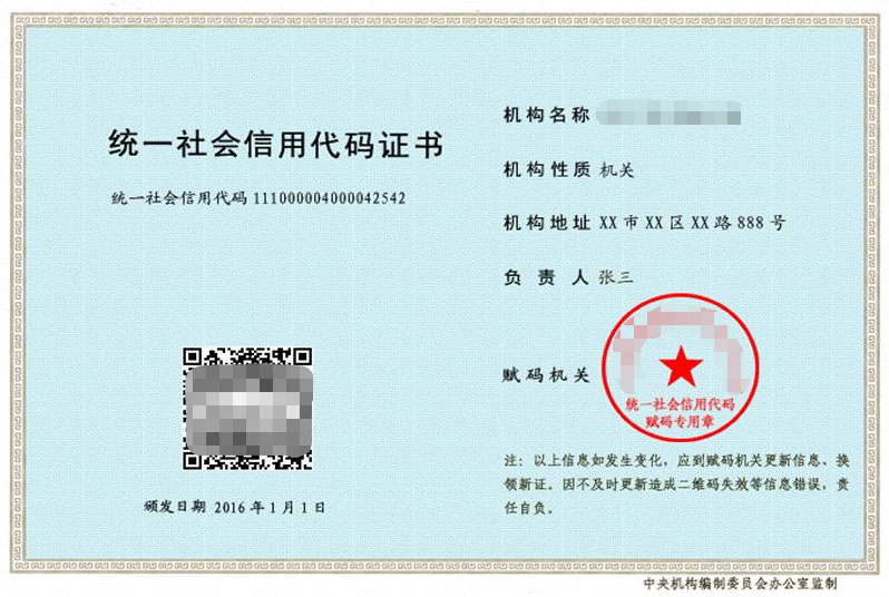 统一社会信用代码证示例